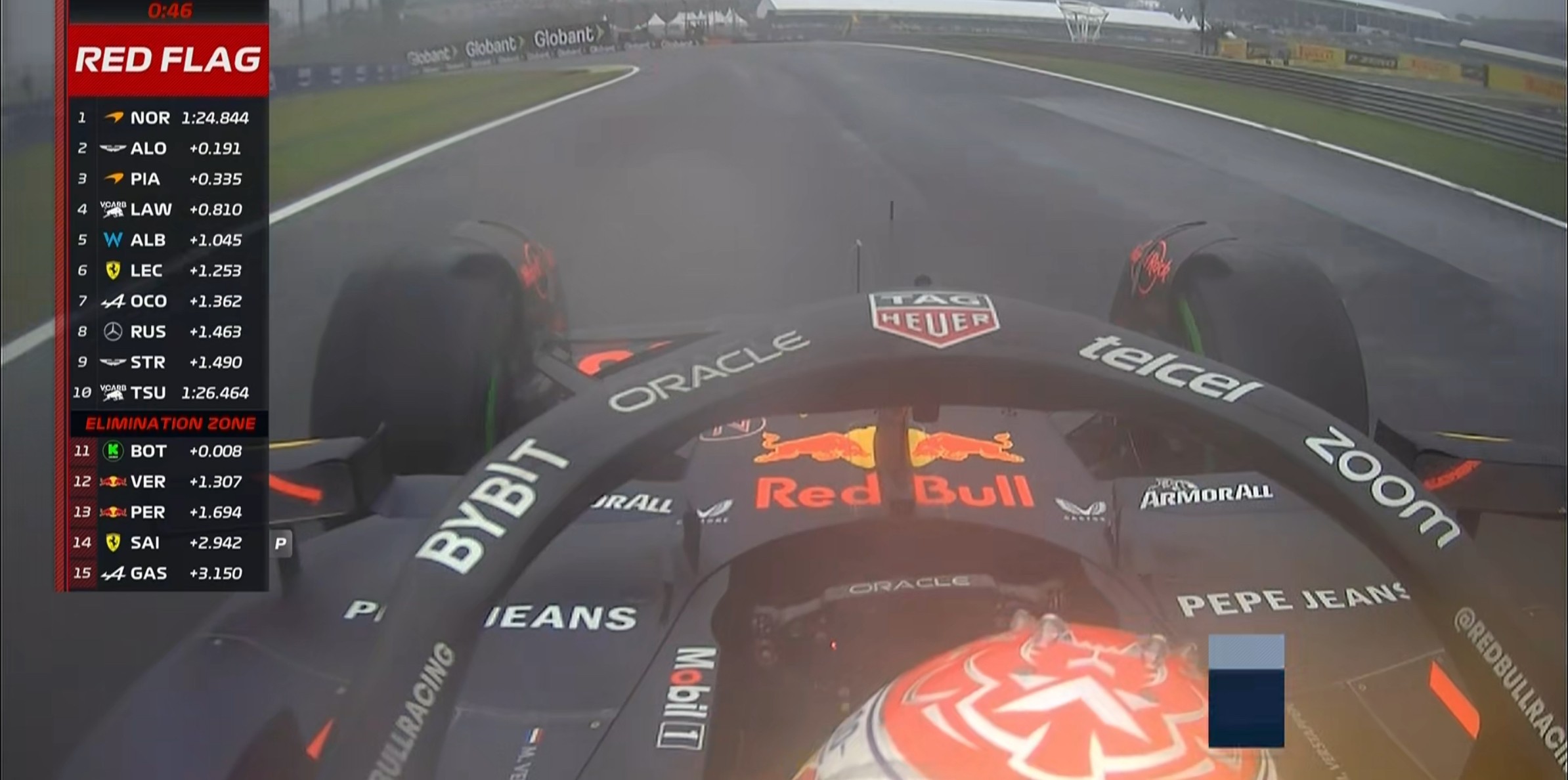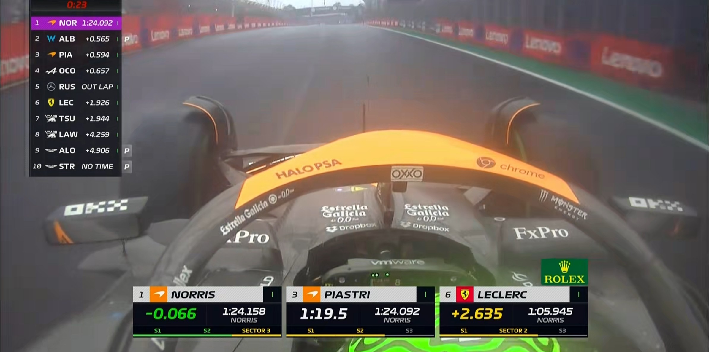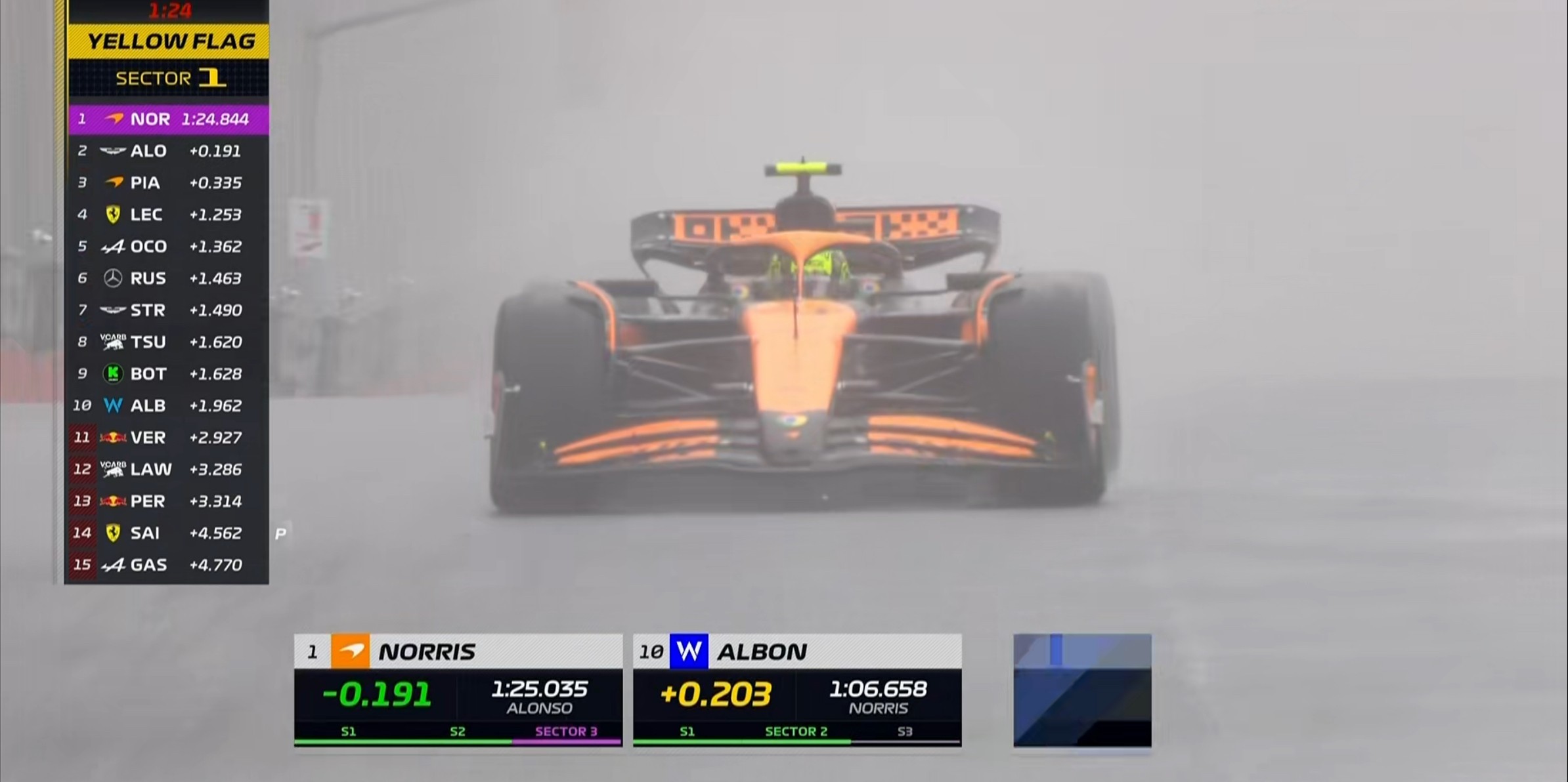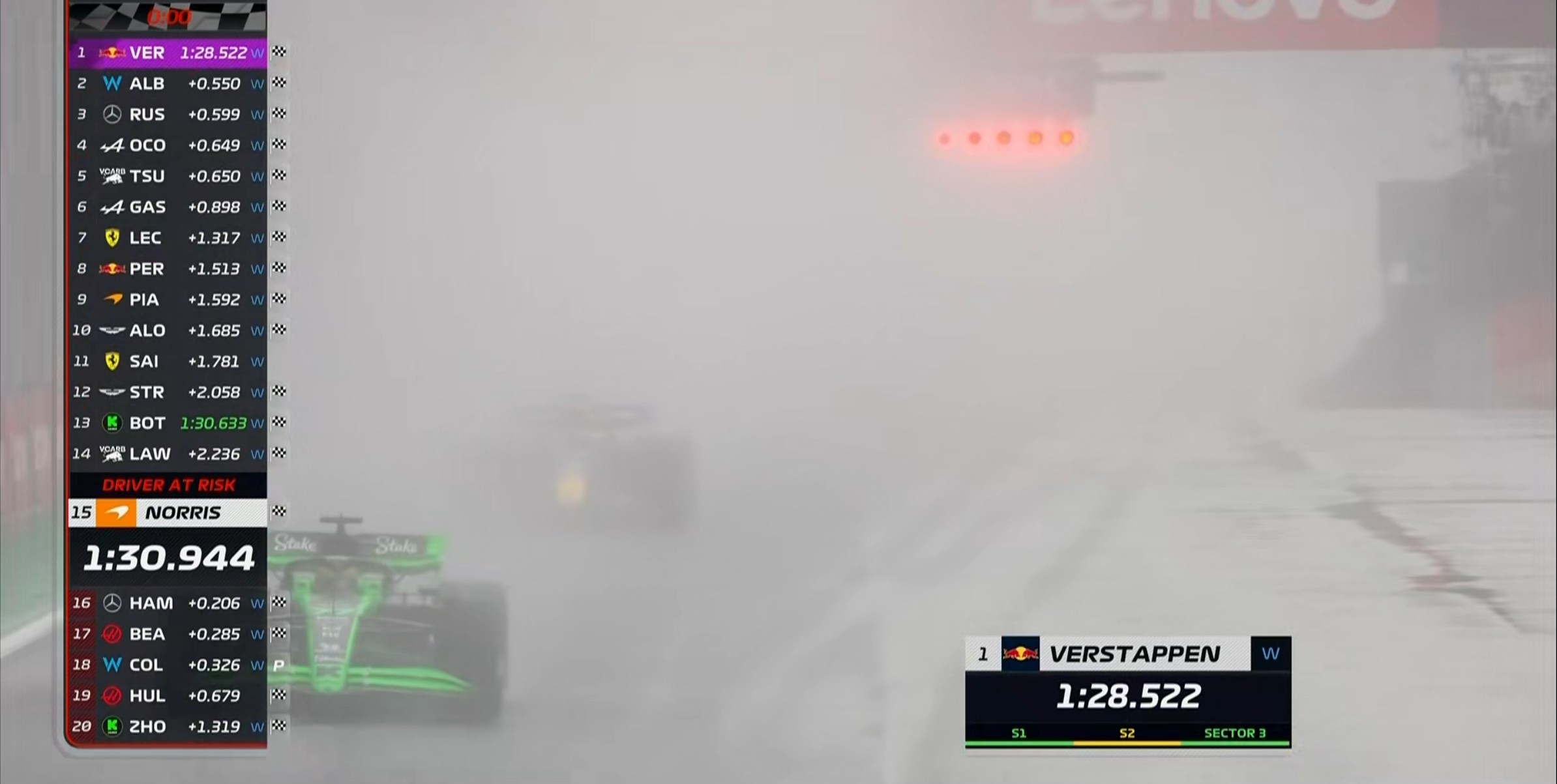 现场的能见度非常糟糕,诺里斯的首个飞驰圈成绩比干地要慢20秒左右!