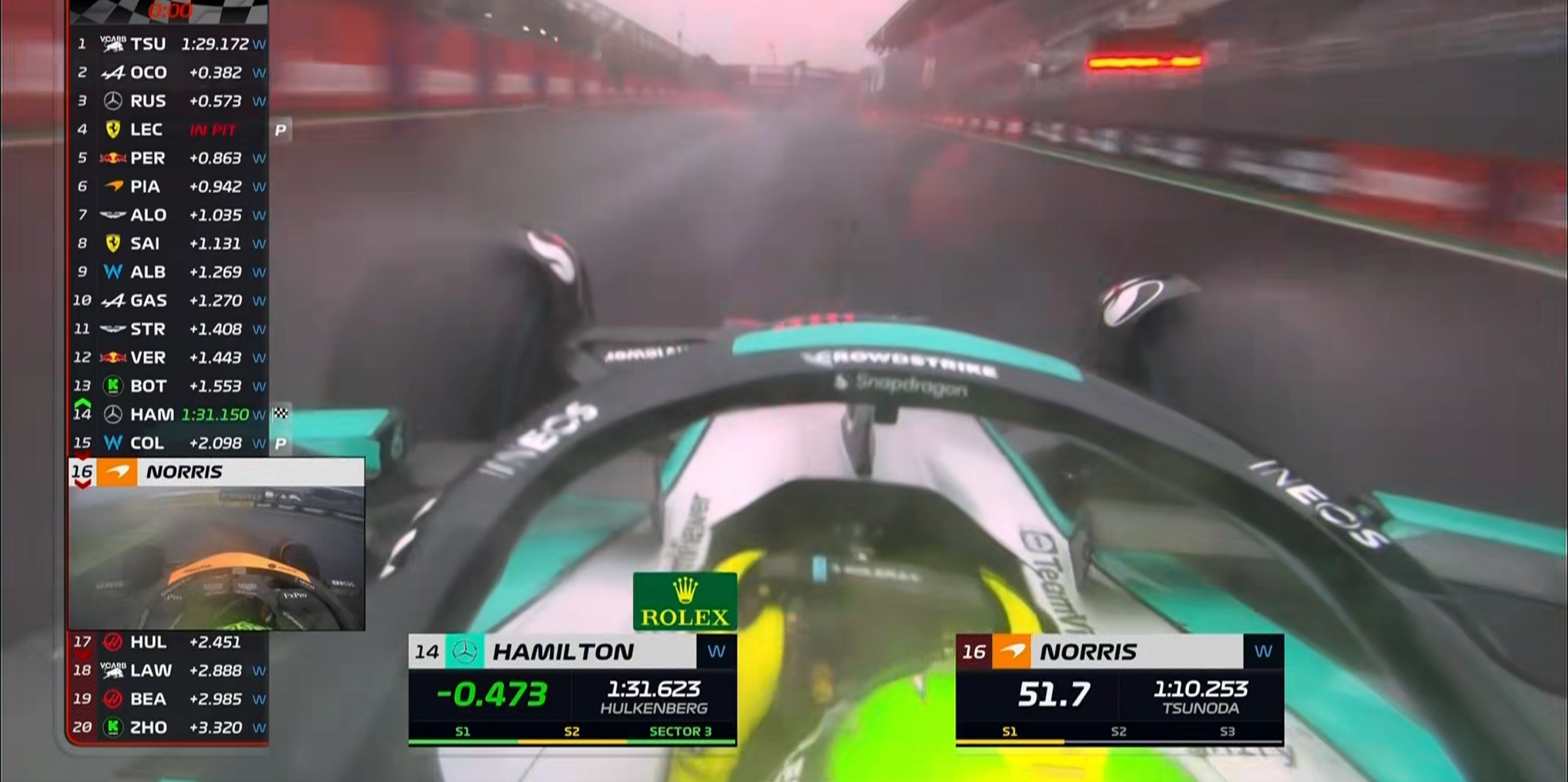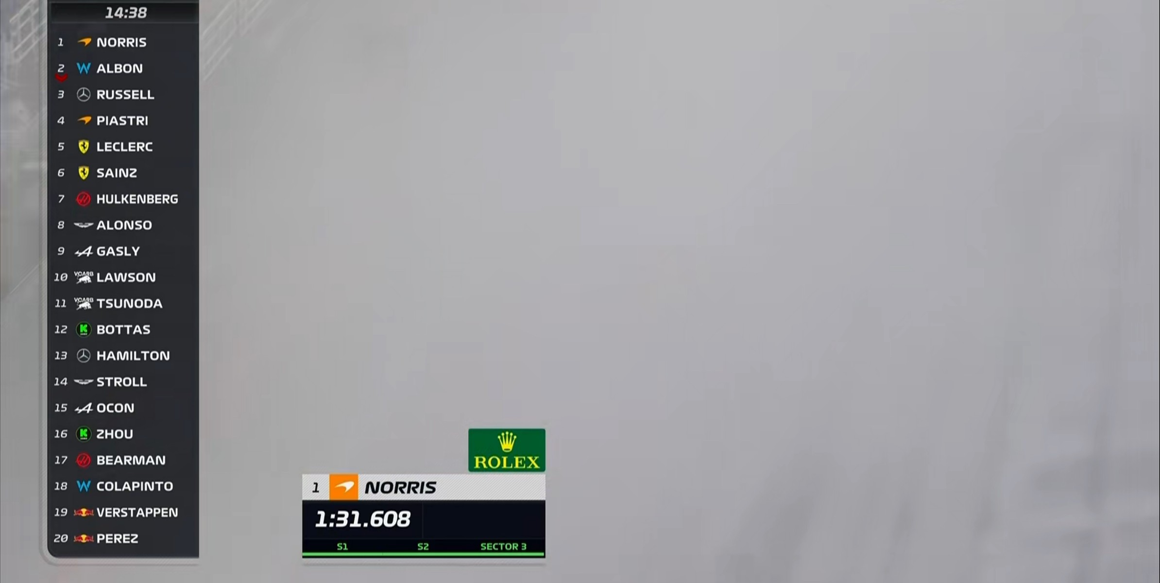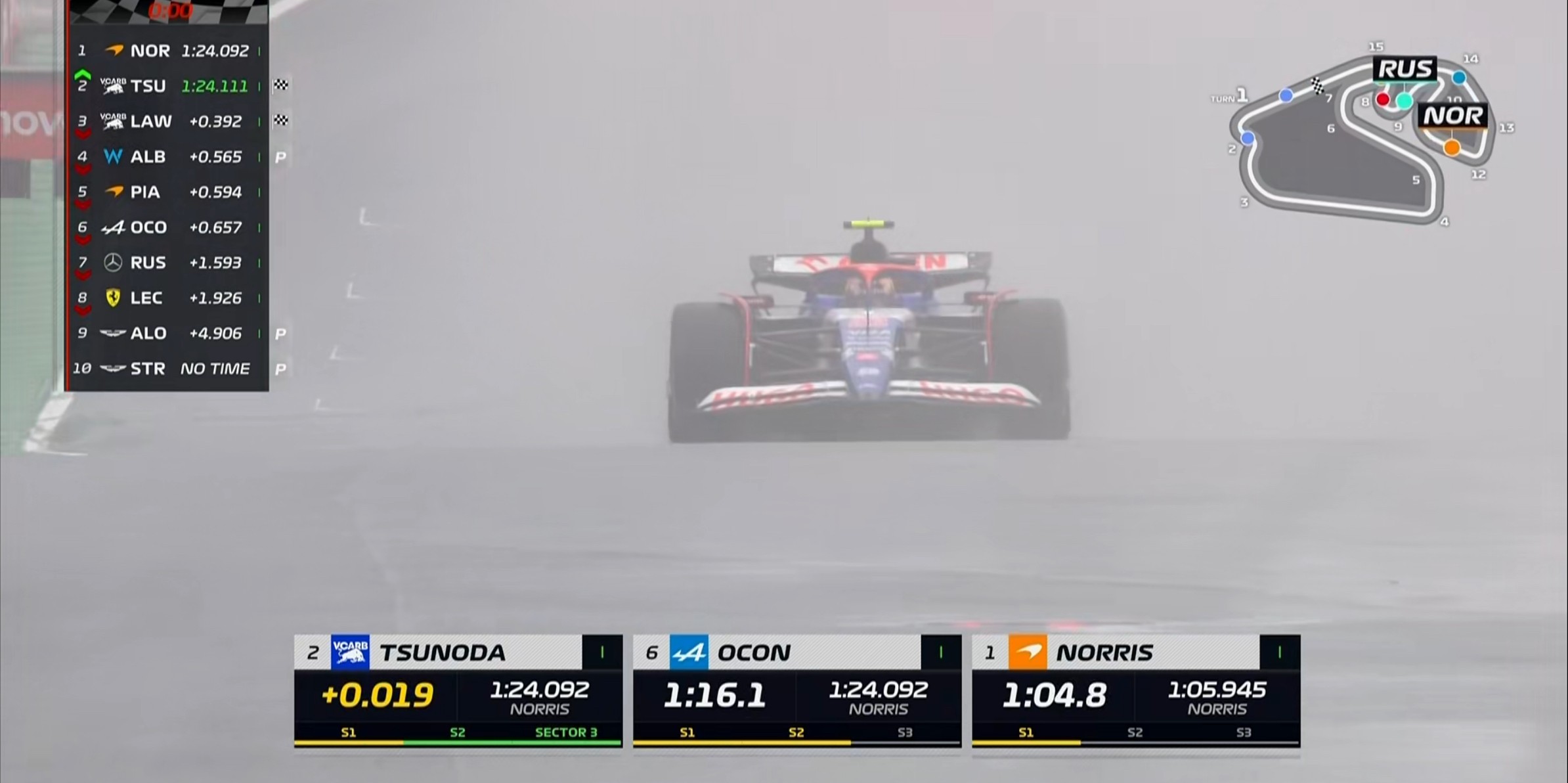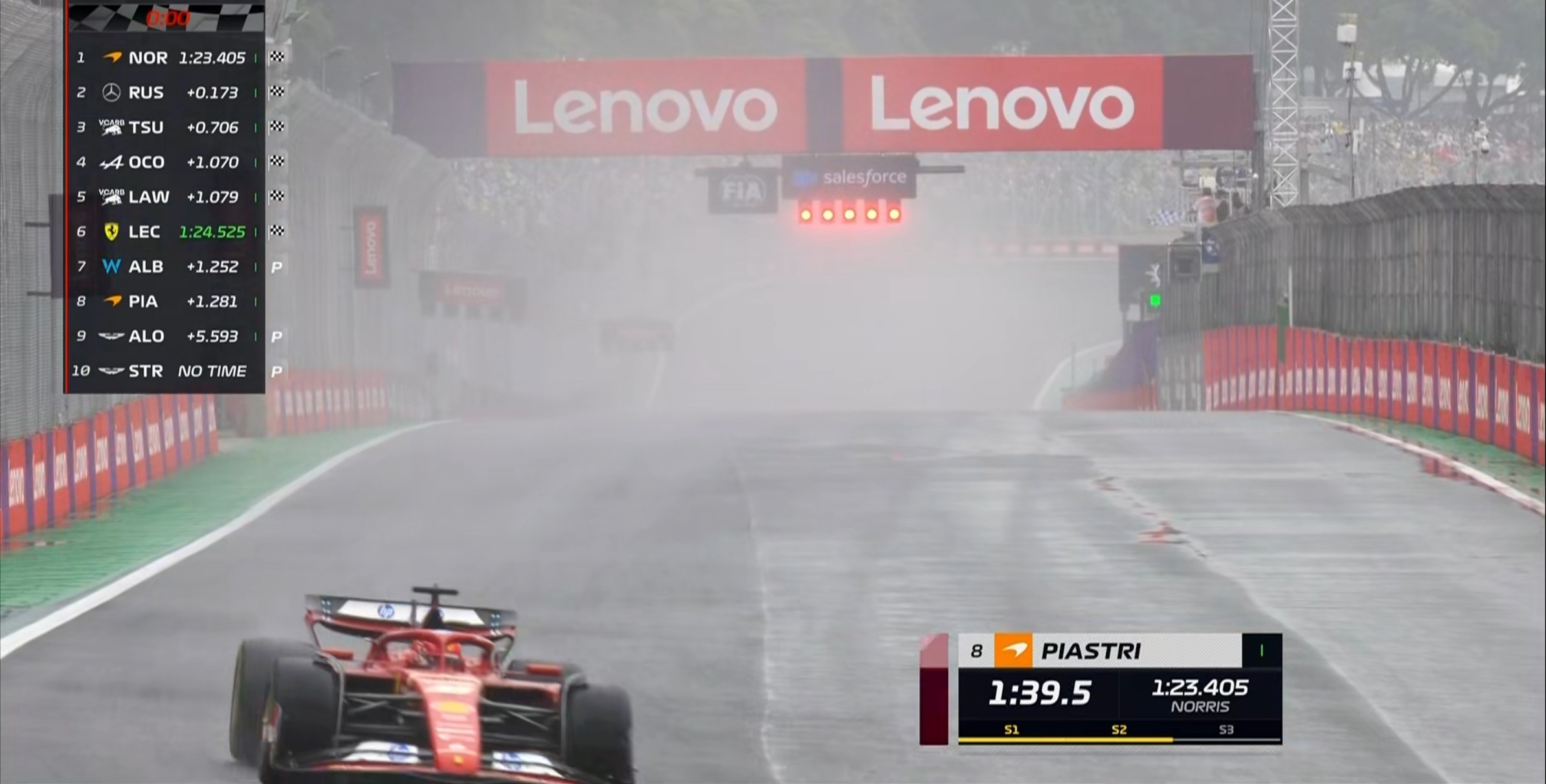 现场的能见度非常糟糕,诺里斯的首个飞驰圈成绩比干地要慢20秒左右!