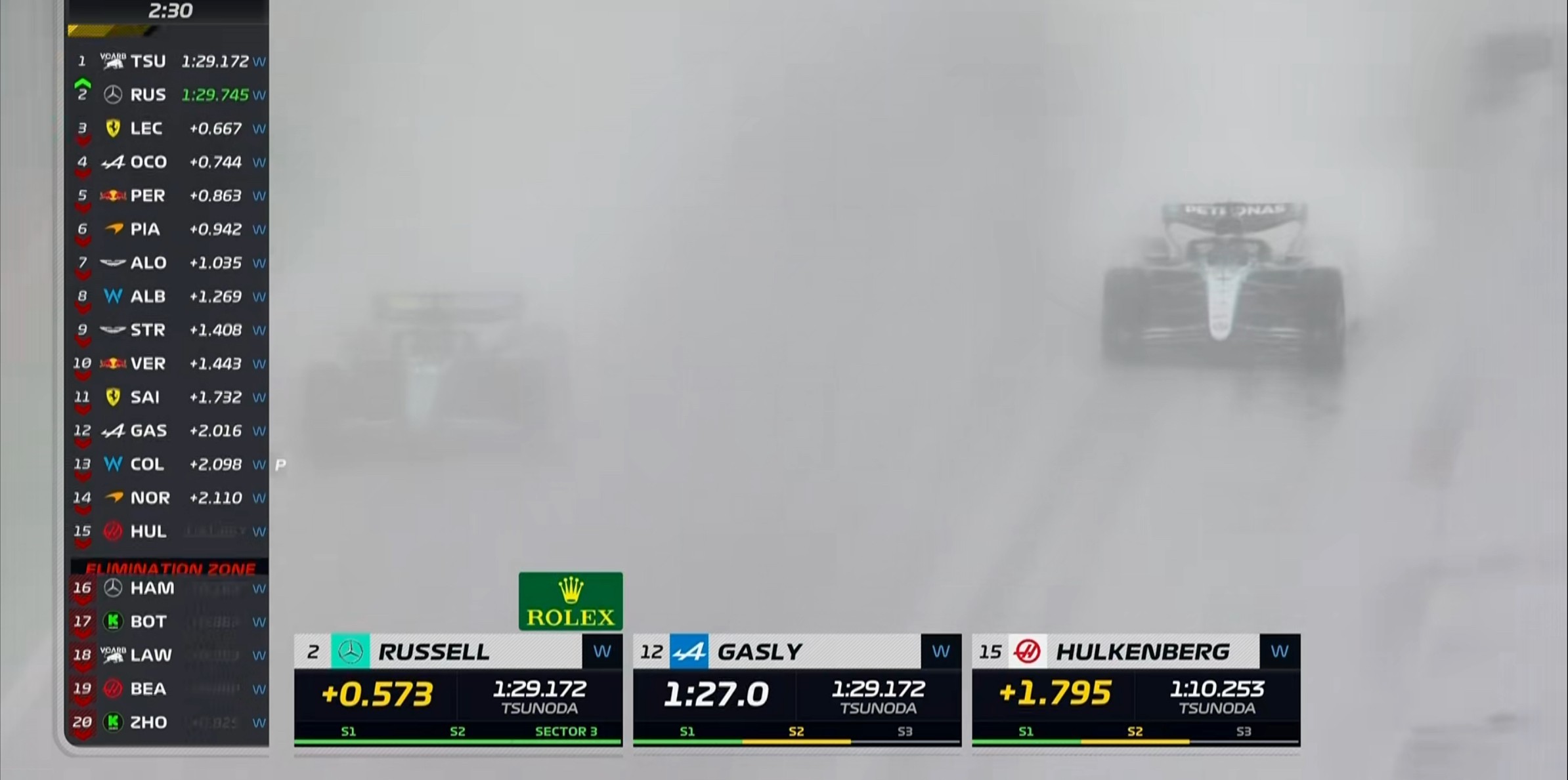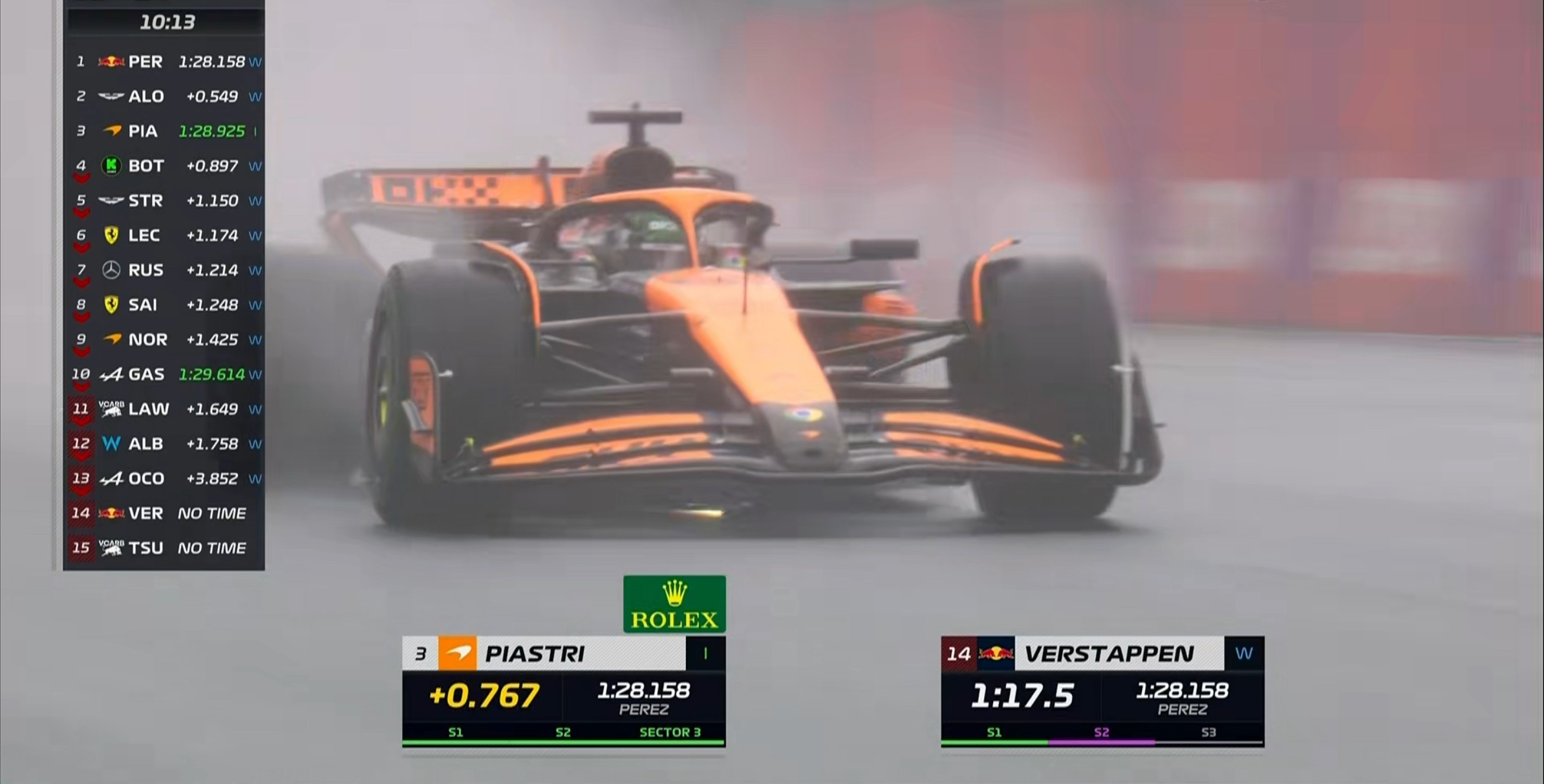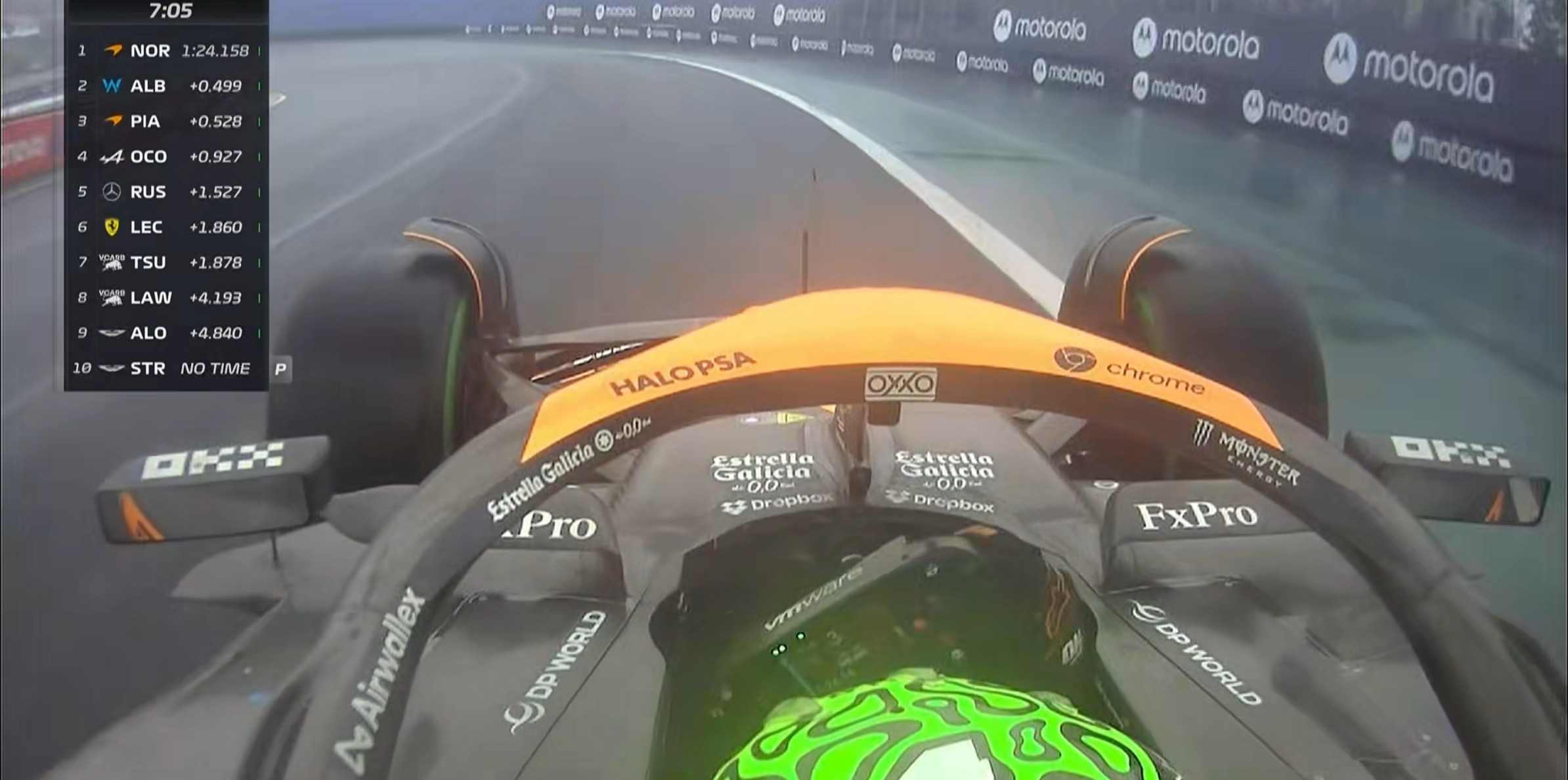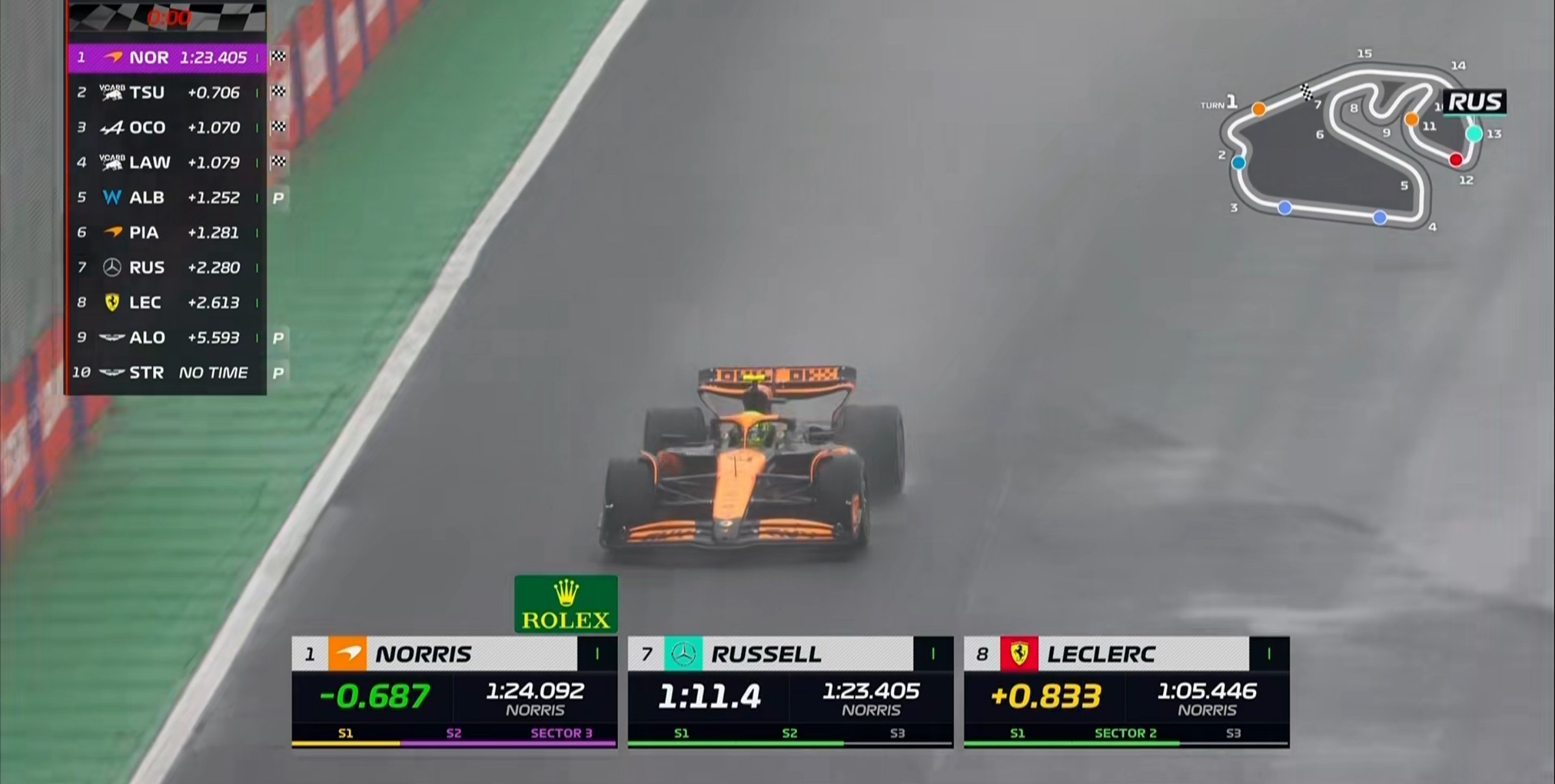 现场的能见度非常糟糕,诺里斯的首个飞驰圈成绩比干地要慢20秒左右!