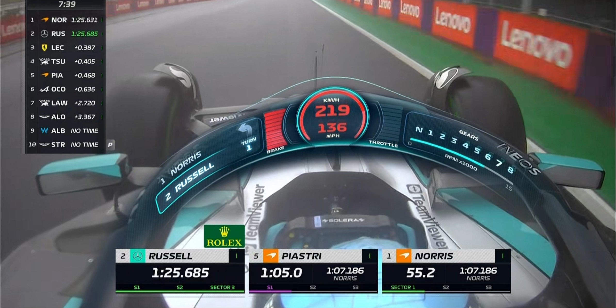 大家陆续做出有效成绩,诺里斯暂时领跑,拉塞尔、勒克莱尔位居二三。