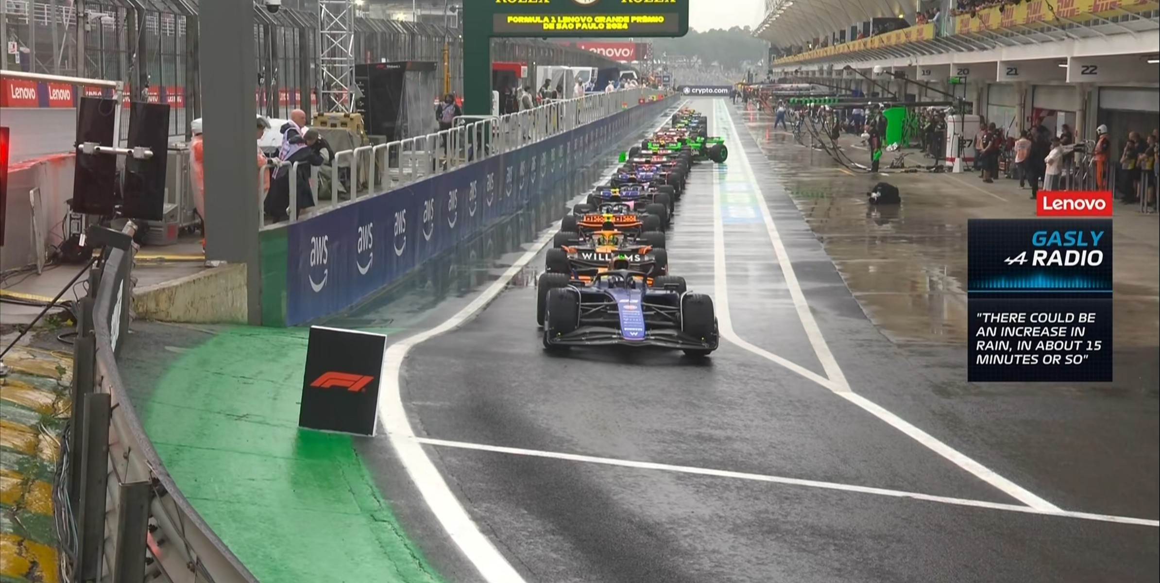 Q1准备起表,加斯利的工程师表示在15分钟后降雨会有增大的趋势,这将为今天的比赛带来变数!