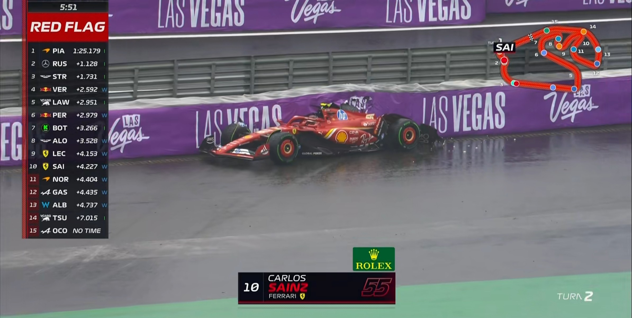 红旗×2!塞恩斯在2号弯spin上墙,赛车后悬挂严重受损,Q2暂停!