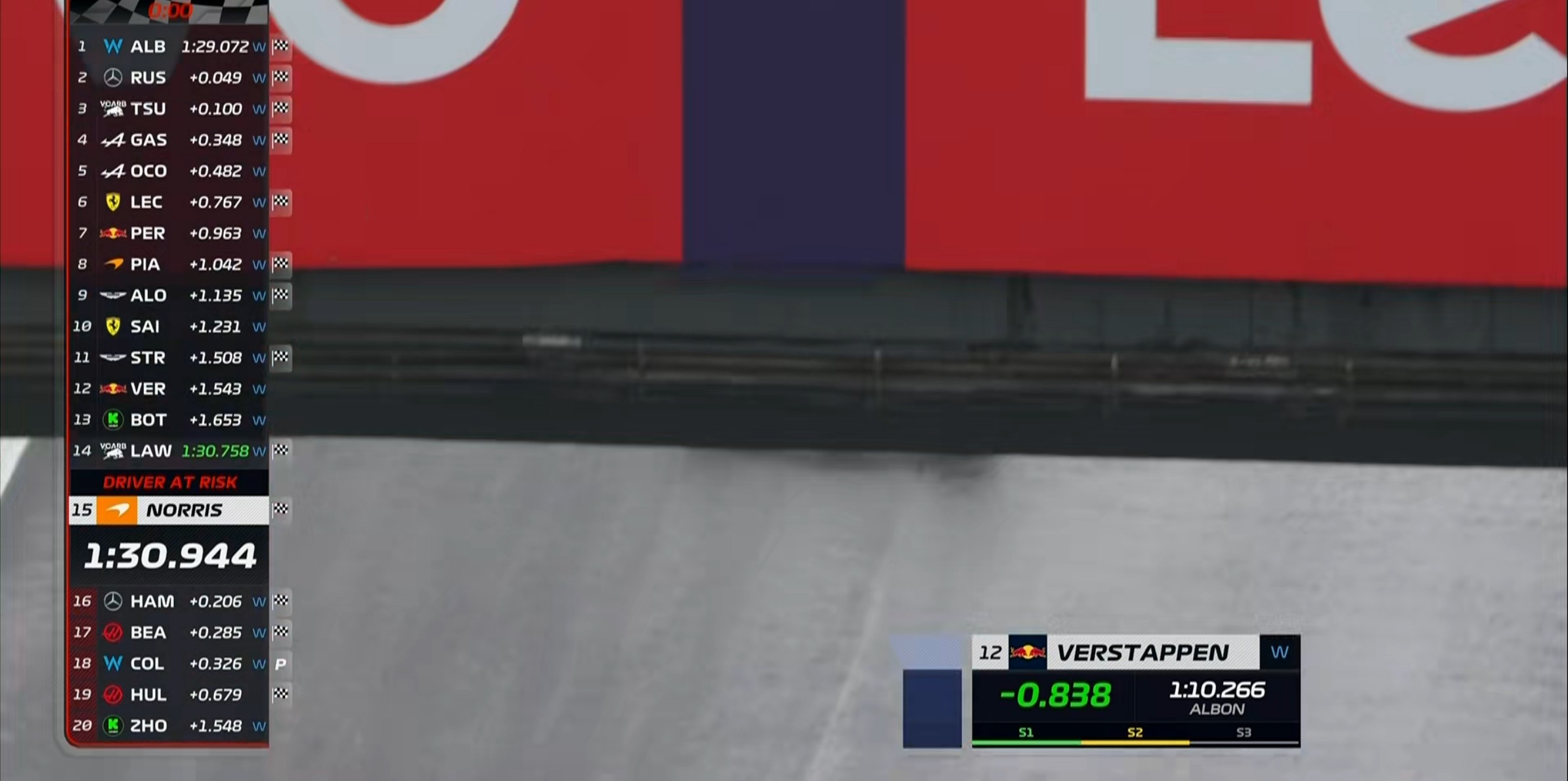 诺里斯第三段刷紫来到第1,两台红牛目前都处在淘汰区!