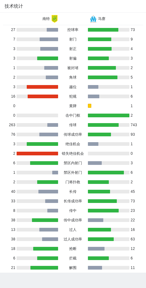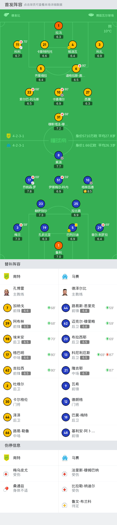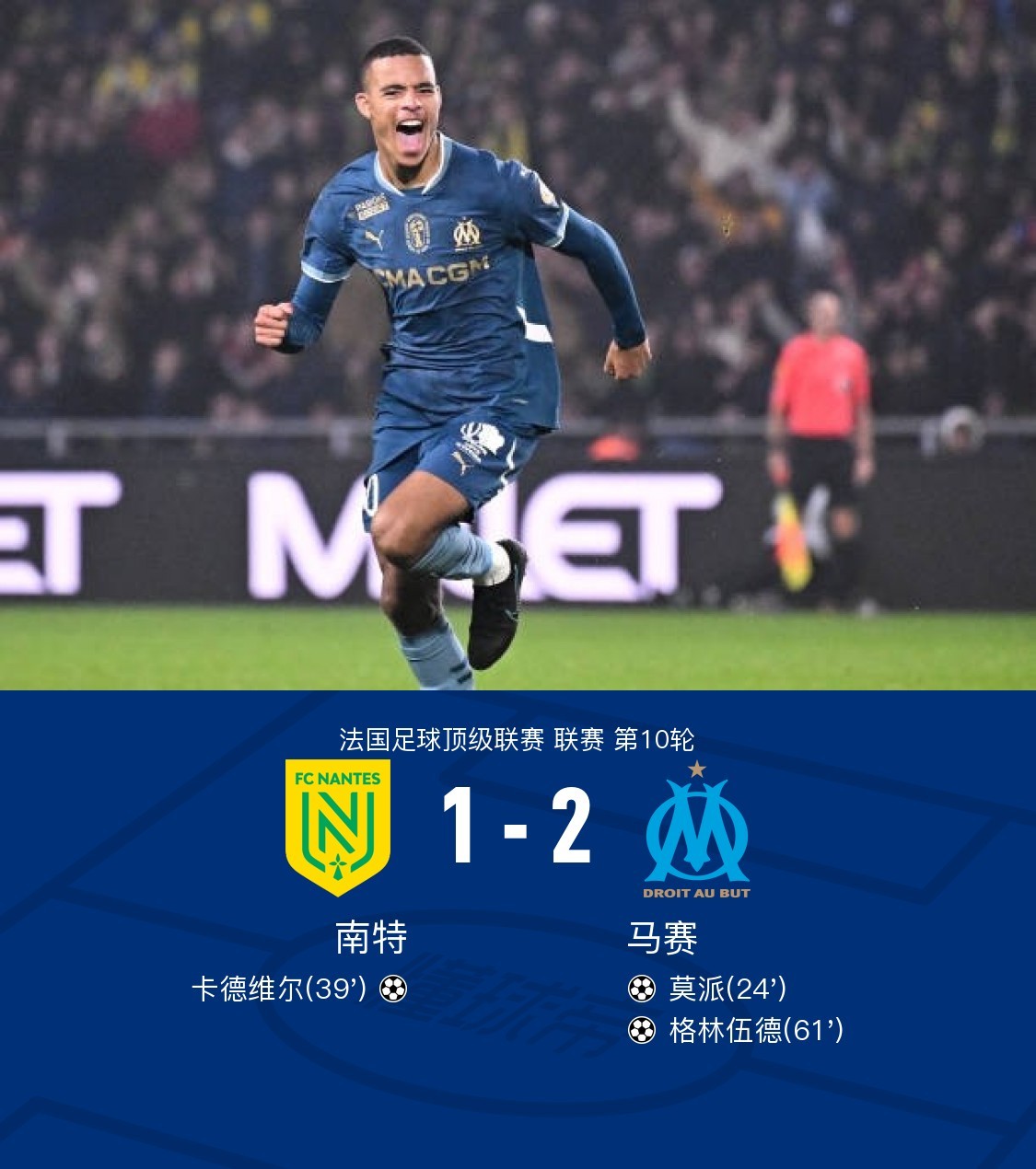 在法国足球顶级联赛第10轮的较量中,南特坐镇主场迎战马赛。上半场,乔纳森-罗助攻,莫派铲射破门。随后,卡德维尔帮助南特扳平比分。下半场,格林伍德闪开角度后送出贴地斩,皮球窜入死角。全场比赛结束,马赛客场2-1击败南特。