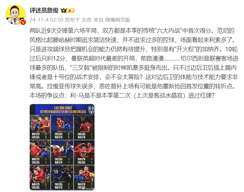 赛后,知名体育评论员詹俊在个人社媒发文:两队近9次交锋第六场平局,双方都是本季的传统“六大内战”中首次得分。范尼的风格比起滕哈赫时期追求简洁快速,并不追求过多的控球,场面看起来利索多了。只是进攻端球员把握机会的能力仍然有待提升,特别是有“开火权”的加纳乔。10轮过后只积12分,曼联英超时代最差的开局,前路漫漫............切尔西则是联赛客场进球最多的队伍,“三叉戟”被限制的时候凯塞多挺身而出。只不过边后卫后插上踢内锋或者是十号位的战术安排,会不会太冒险?这对边后卫的体能与技术能力要求非常高。拉维亚传球失误多,恩佐替补上场有可能是他重新抢回首发位置的转折点。本场的争议点:利-马是不是本季第二次(上次是客战水晶宫)逃过红牌?