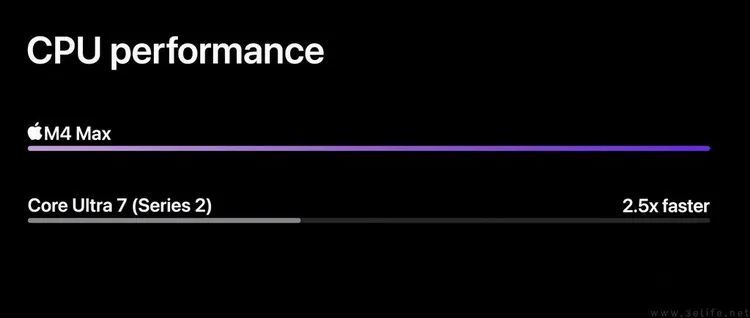 比较有意思的是,在官方公布的性能对比案例中,M4 Max不仅被拿来对比了M1 Max(据称CPU提升了2.2倍),同时还被用于和酷睿Ultra7 258V进行了比较。按照苹果方面的说法,是M4 Max的CPU比258V快了2.5倍,GPU性能更是可以达到后者的4倍。