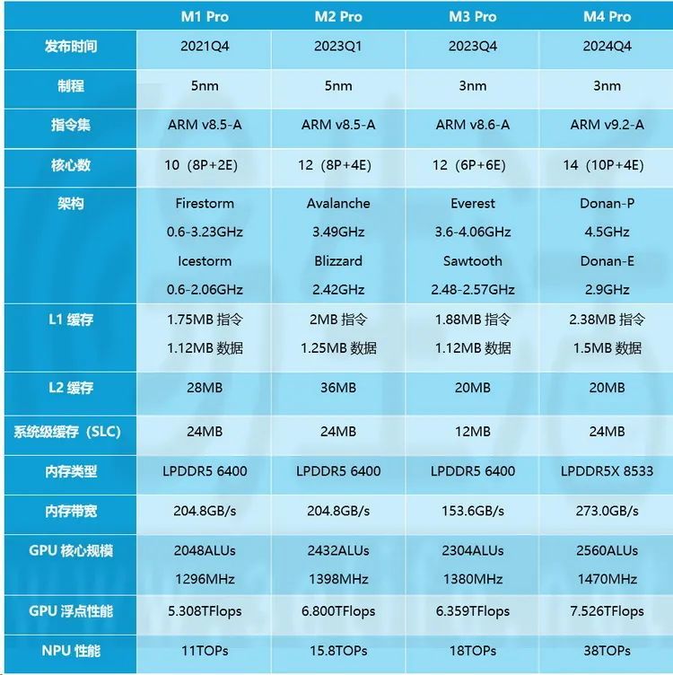 相比之下,M4 Pro这次的产品思路就明显“重回正道”了。如今它有了更多的P核,并凭借制程优势使得主频再创新高。同时其缓存容量也被加了回来,内存位宽、内存频率和GPU规格也都迎来显著的提升。