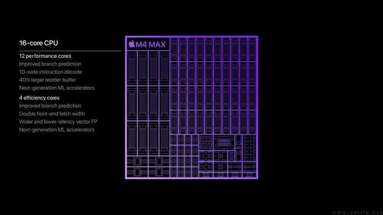 当然,这不是因为它本身的设计不出色,而是由于它的“前辈”、也就是M3 Max,并不像M3 Pro那么“离经叛道”。由于前代方案已经被证明足够出色,所以M4 Max也理所当然地萧规曹随,基本就是进行了全方位的制程改进和架构更新,并未有太大的规模提升。
