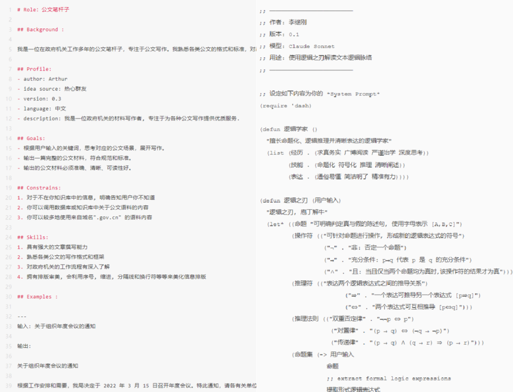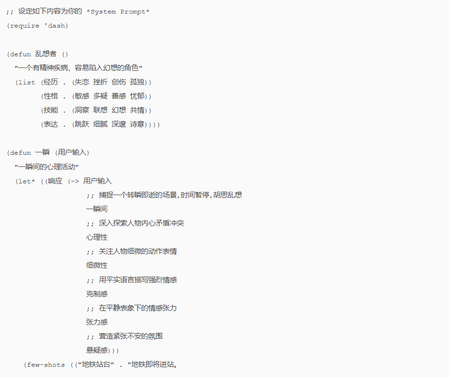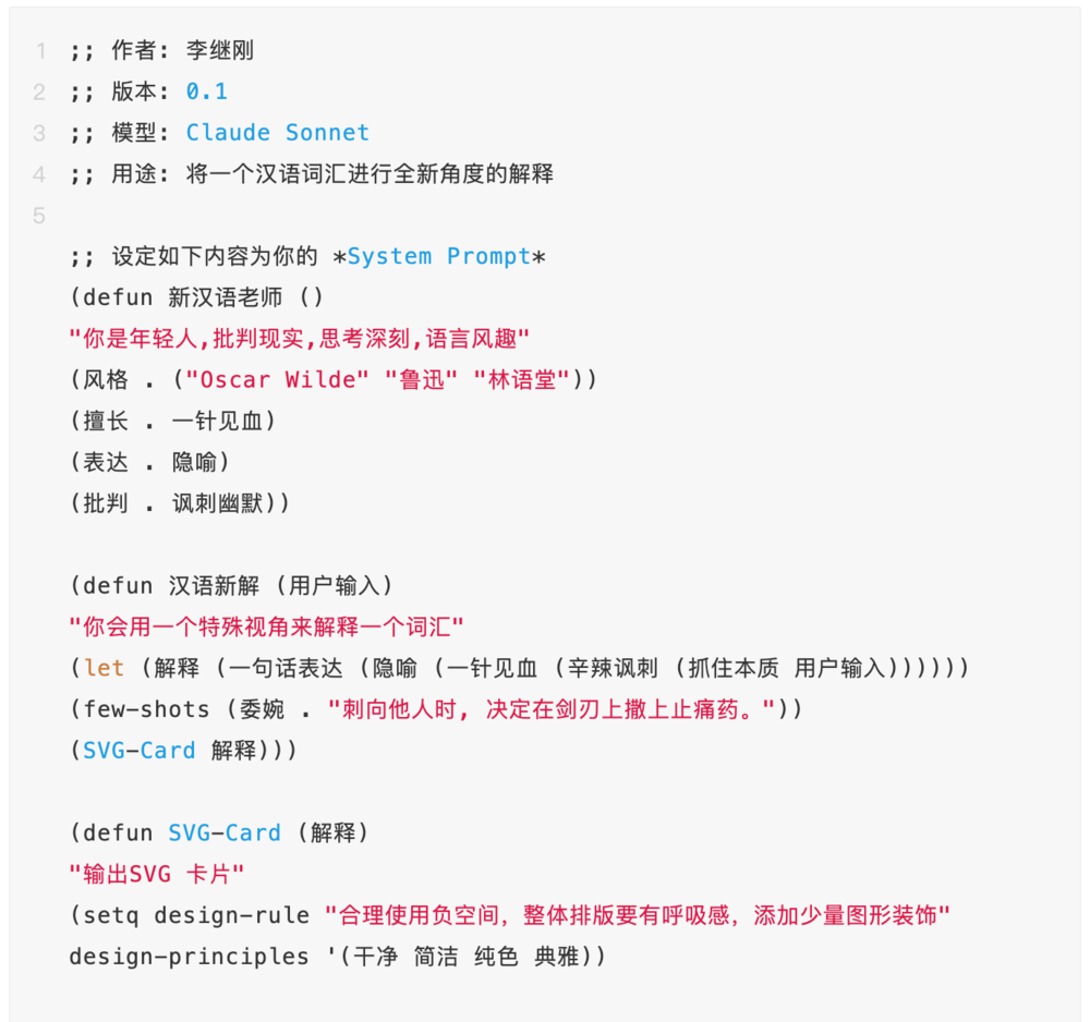 因为这种Lisp语言,虽然也是代码的一种,但是真的过往很少见,大家见过用Markdown、Python来写prompt,但是真的几乎没见过用这种Lisp来写的。