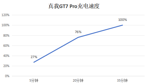在续航和充电方面,真我GT7 Pro配备了一块6500mAh泰坦电池和120W快充,这在同档位可是十分少见。而且不得不说,这块泰坦大容量电池是真的很顶,在20%电量下进行游戏也没有出现降频、掉帧的问题。而在补能方面,我们使用真我GT7 Pro自带的充电组合,以1%电量为起点,结果发现,5分钟电量就达到了27%,20分钟电量已经充至76%,最终我们只用了35分钟就将这块大电池充满了。这样的充电速度和续航能力,意味着真我GT7 Pro可以支持长时间游戏和娱乐,并且日常使用只要利用碎片时间即可为手机进行补电。