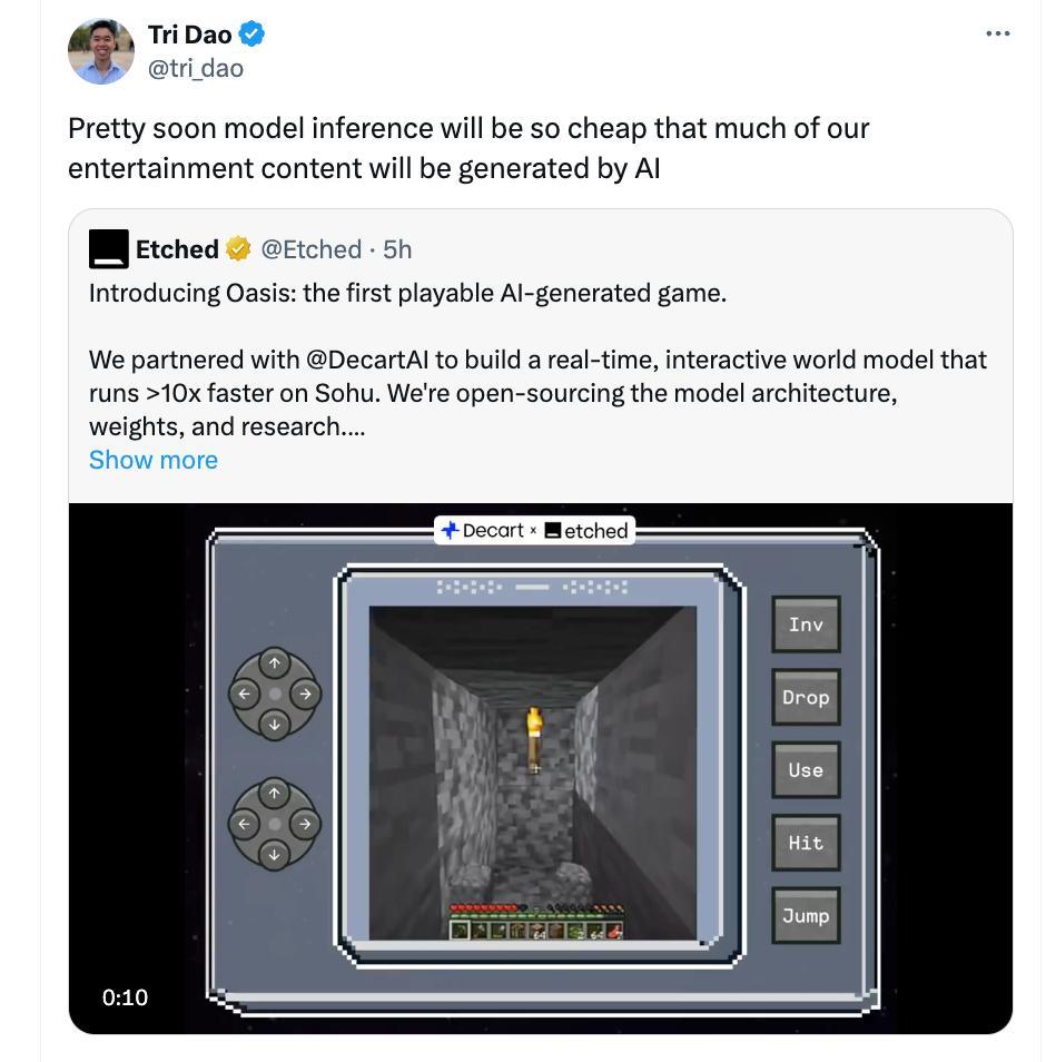 AI 领域的专家而言也都在关注 Oasis。FlashAttention 作者,普林斯顿助理教授 Tri Dao 等诸多大佬纷纷点赞:「很快模型推理就会变得非常便宜,我们的许多娱乐内容都将由人工智能生成」。