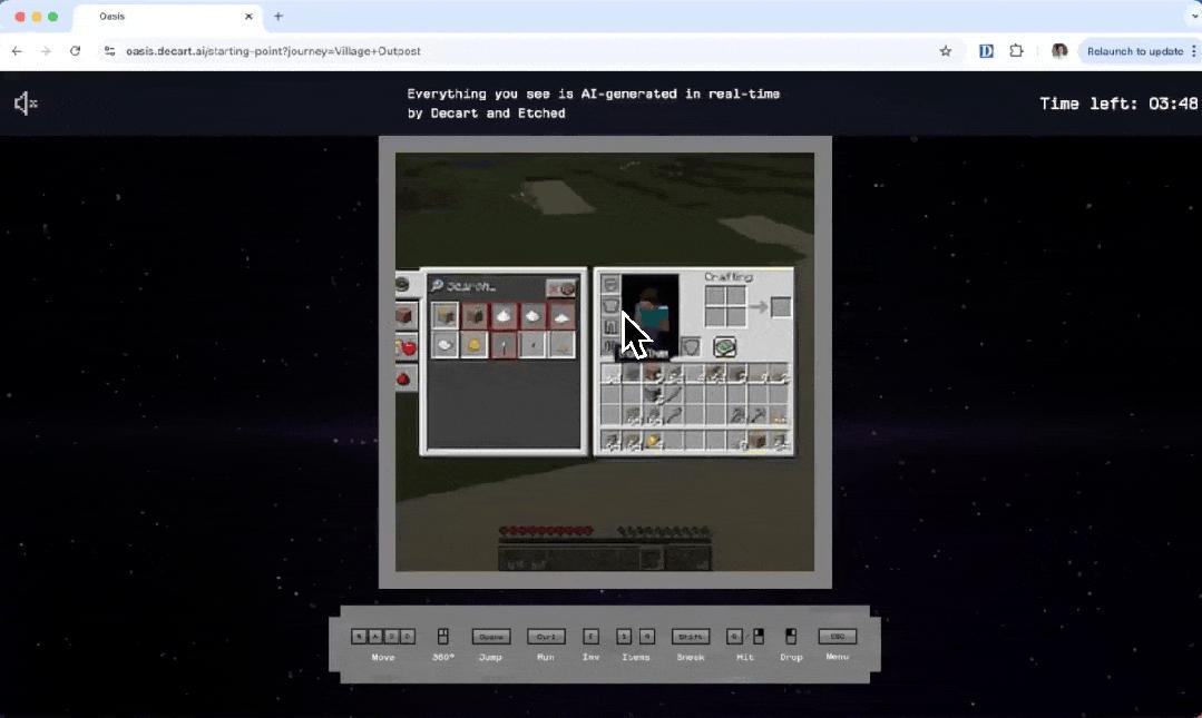 昨天,两家初创公司 Etched、 Decart AI 联手,带来了世界上首个实时生成的 AI 游戏 Oasis,你在其中体验到的每一帧都来自扩散模型的实时预测,游戏画面持续以 20 帧每秒的速度实时渲染,零延迟。