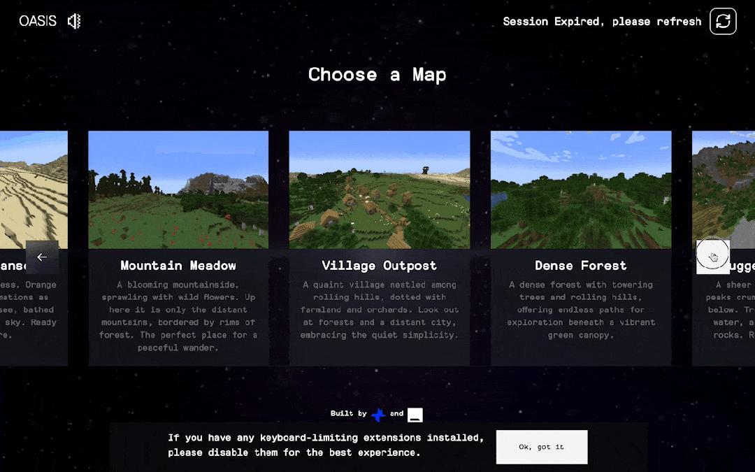 从海岸、村庄、森林、沙漠等地形中选择一个,就能正式开启体验了。(由于 Oasis 太过火爆,想真玩上还要排一会儿队,算力有限,每位使用者限时体验五分钟。)