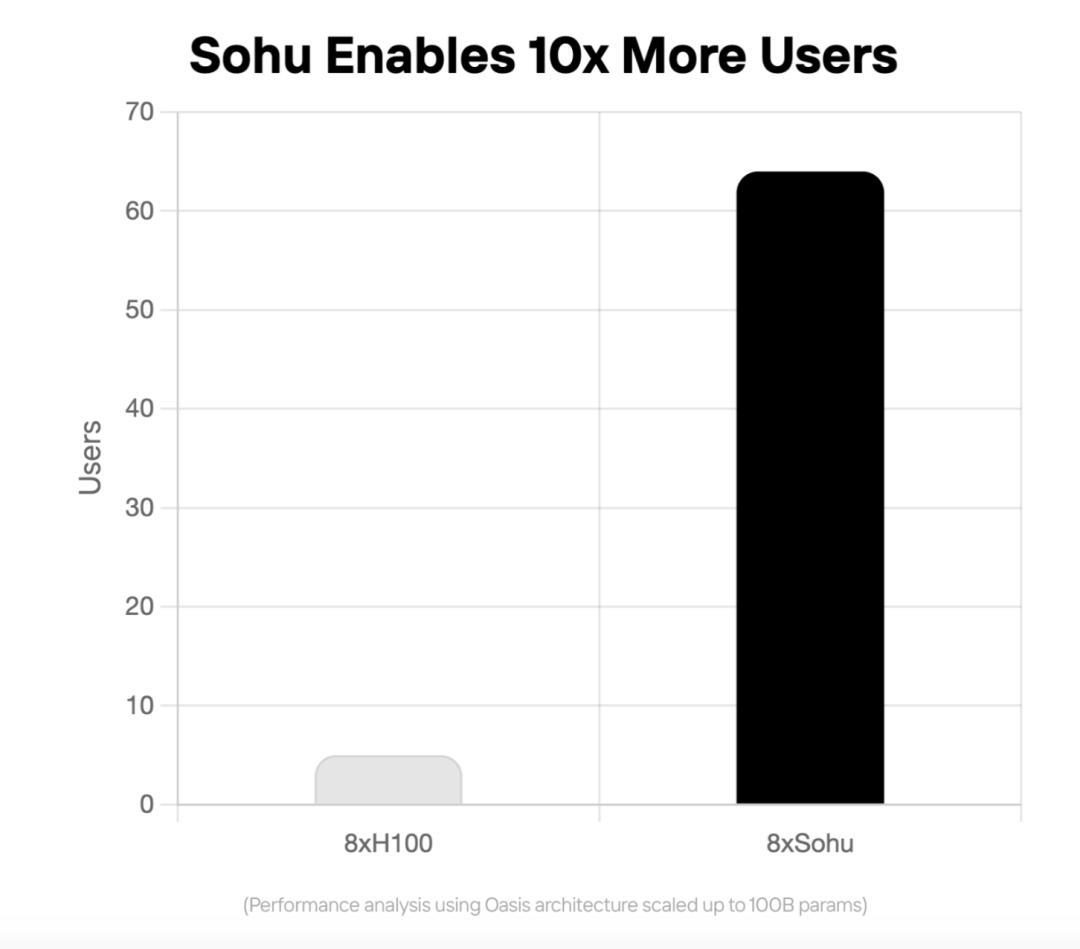 此外,Oasis 的端到端 Transformer 架构使其在 Sohu 上运行非常高效,即使在 100B+ 参数模型上也可以为 10 倍以上的用户提供服务。对于像 Oasis 这样的生成任务来说,价格显然是可运作的隐藏瓶颈。