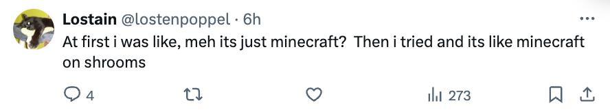 这位网友的形容很贴切:「开始的时候,我以为是《我的世界》,后来亲自尝试过之后,这是吃了菌子再玩的《我的世界》。」