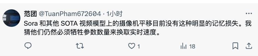 而像 Sora,或者同样都旨在模拟物理世界的其他视频模型,在把「镜头」平移回来之后就没有这种明显的记忆损失。对此,有网友猜测是牺牲了参数数量来换取实时的推理速度。