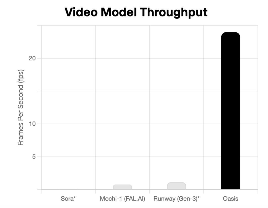 Oasis 游戏以每秒 20 帧的速度生成实时输出。目前最先进的具有类似 DiT 架构的文本转视频模型(例如 Sora、Mochi-1 和 Runway)可能需要 10-20 秒才能创建一秒钟的视频,即使在多个 GPU 上也是如此。然而,为了匹配玩游戏的体验,Oasis 的模型必须最多花每 0.04 秒生成一个新帧,速度快了 100 倍以上。