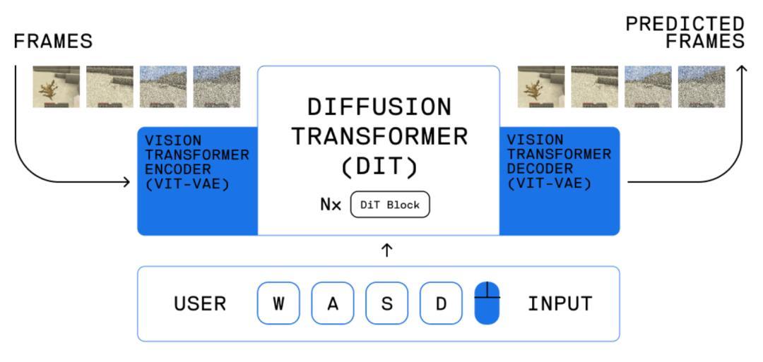 模型由两部分组成:一个空间自编码器和一个潜在扩散模型结构。这两部分都基于 Transformer 模型:自编码器基于 ViT,而主干则基于 DiT。与最近的基于动作的世界模型如 GameNGen 和 DIAMOND 不同,Oasis 的研究团队选择了 Transformer 来确保稳定、可预测的扩展。