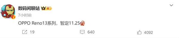 11月4日,CNMO了解到,据博主“数码闲聊站”透露,OPPO Reno 13系列暂定11月25日正式发布。