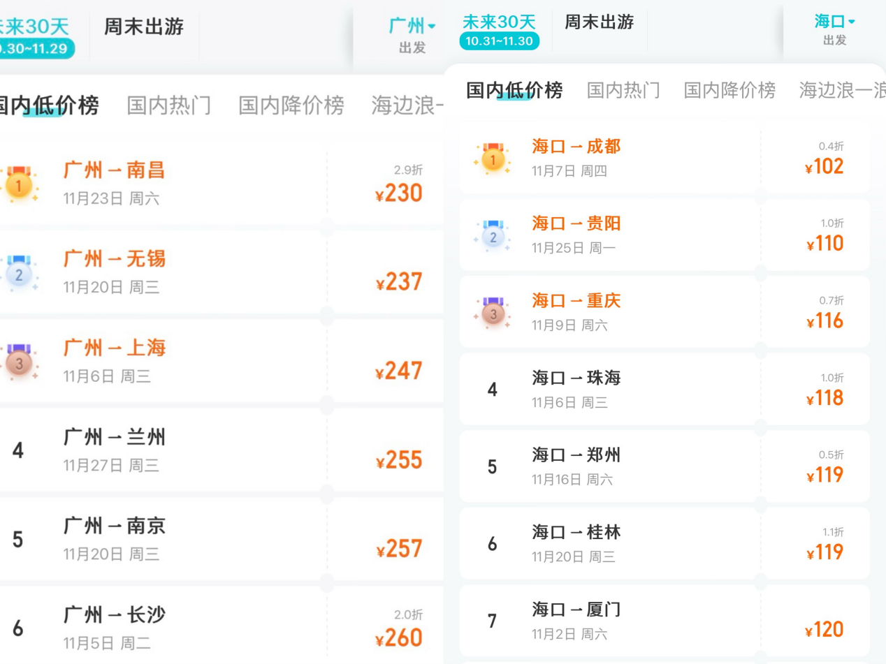 十一国庆黄金周过后,旅游市场便进入了淡季,此时错峰出行能省下不少旅行费用。《消费者报道》记者观察发现,近期的机票价格大幅下跌,有的跌至百元价格,甚至比高铁票还便宜。