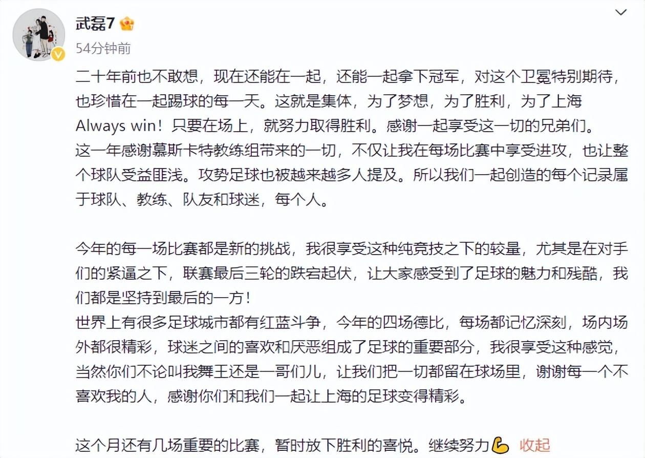 武磊写道:二十年前也不敢想,现在还能在一起,还能一起拿下冠军,对这个卫冕特别期待,也珍惜在一起踢球的每一天。这就是集体,为了梦想,为了胜利,为了上海Always win!只要在场上,就努力取得胜利。感谢一起享受这一切的兄弟们。
