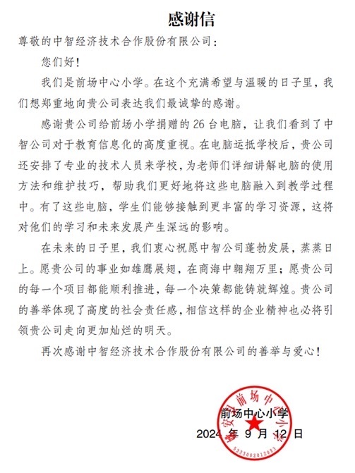 与此同时,中智股份在得知对口帮扶的云南姚安县前场中心小学帮扶需求后捐赠了26套电脑,帮助当地改善教学和工作条件。