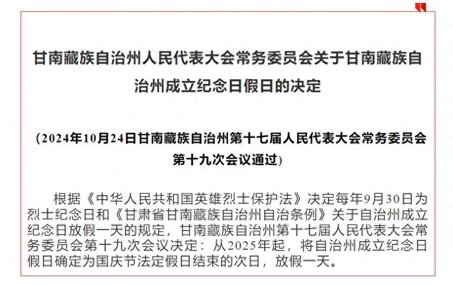 根据《中华人民共和国英雄烈士保护法》决定每年9月30日为烈士纪念日和《甘肃省甘南藏族自治州自治条例》关于自治州成立纪念日放假一天的规定,甘南藏族自治州第十七届人民代表大会常务委员会第十九次会议决定:从2025年起,将自治州成立纪念日假日确定为国庆节法定假日结束的次日,放假一天。