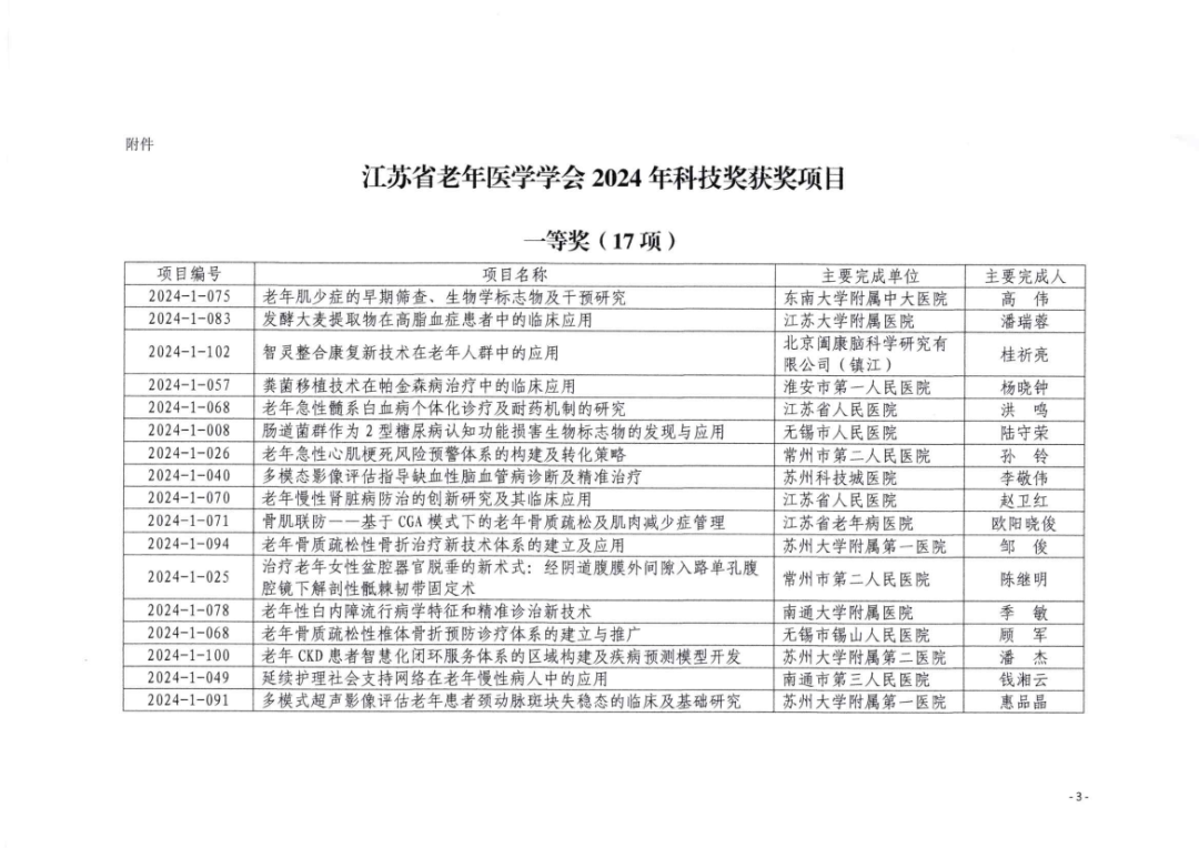 11月4日,江苏省老年医学会公布了2024年度科学技术奖获奖名单,东南大学附属中大医院高伟教授团队申报的项目《老年肌少症的早期筛查、生物学标志物及干预研究》荣获一等奖。