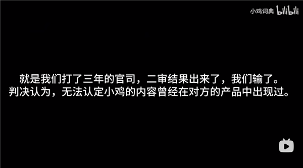 小鸡词典官方账号近日发布视频宣布:“打了三年的官司,二审结果出来了,我们输了。判决认为,无法认定小鸡的内容曾经在对方的产品中出现过。”
