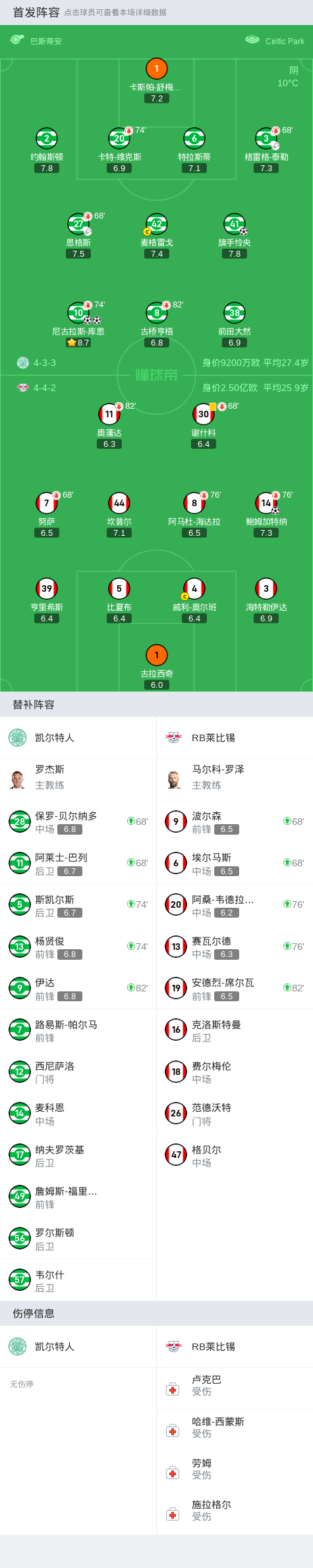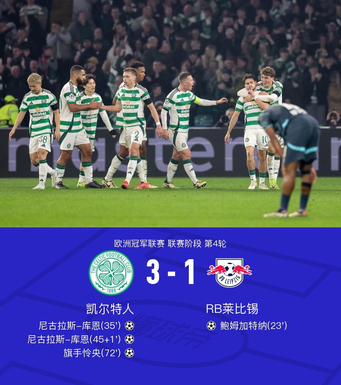 在欧洲冠军联赛的较量中,凯尔特人与RB莱比锡展开了一场激烈的对决。比赛中,RB莱比锡的鲍姆加特纳率先为球队取得进球。随后,凯尔特人的恩格斯送出精妙助攻,帮助尼古拉斯-库恩扳平比分。紧接着,格雷格-泰勒再次助攻尼古拉斯-库恩,后者成功完成梅开二度,为凯尔特人反超比分。比赛接近尾声时,旗手怜央再下一城,进一步扩大了凯尔特人的领先优势。最终,凯尔特人以3-1的比分战胜RB莱比锡,取得了比赛的胜利。