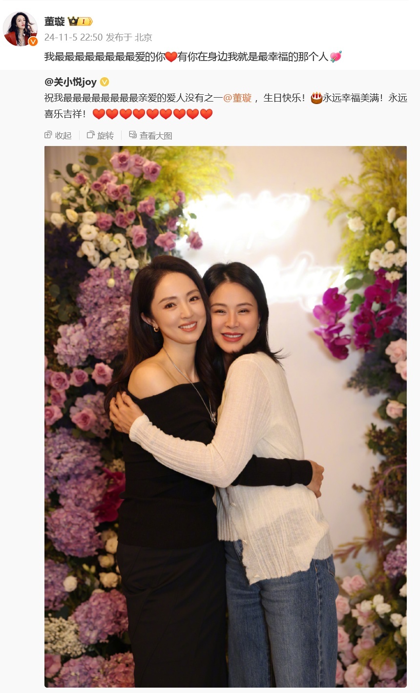 董璇多年好友关悦也晒照祝福:“祝我最最最最最最最最亲爱的爱人没有之一,董璇 ,生日快乐!永远幸福美满!永远喜乐吉祥!”