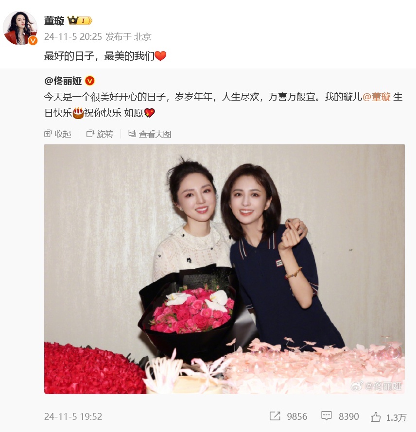 佟丽娅晒出二人合照送上生日祝福:“今天是一个很美好开心的日子,岁岁年年,人生尽欢,万喜万般宜。我的璇儿生日快乐。祝你快乐,如愿。”