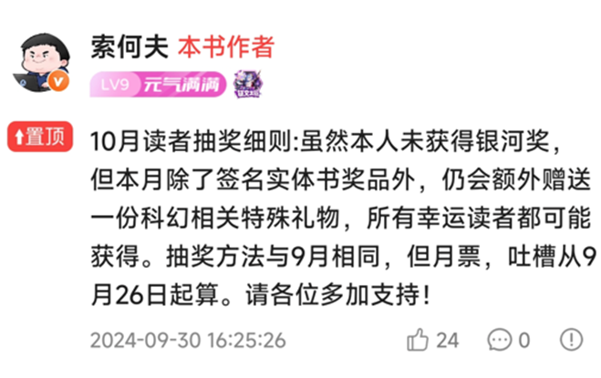 今年6月,“知名科幻作家转行写性转轻小说”的消息在各大书友群中疯传,索何夫的网文生涯也在网友们的热议中迎来了巅峰期。当看热闹的人群逐渐散去,这位全职作家依旧保持着日更的频率。尽管两部作品的订阅数据均不及预期,但索何夫还是愿意坚持自掏腰包,为自己为数不多的读者发放福利。