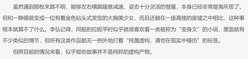而且如果你要说上面这些内容都是阿宅死前不切实际的脑内幻想,那么索何夫多半会义正言辞地告诉你,“性转”和“变身”都属于非常经典的科幻题材。这些元素最早出现于上世纪30到40年代的一系列“意识转移”题材小说中,后世也不乏《灵魂之井的午夜》、《黑暗的左手》这类正儿八经地讨论“性别认知”的科幻大作。