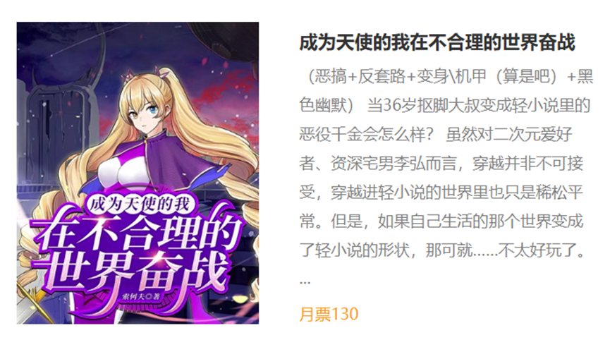 他是轻小说平台菠萝包的签约作者。目前他手里共有两部SF题材的轻小说正在连载,其中一部讲的是36岁抠脚大汉性转成为美少女在异世界展开冒险;另一部则是变成智能防具的军宅在异世界养女儿的故事。先不谈这两部作品够不够科幻,起码二次元浓度这块已经拉满。