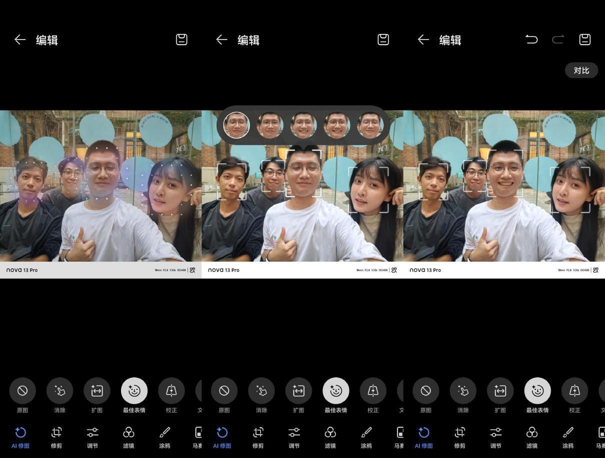 还有 AI 最佳表情功能,华为nova 13系列可以从连拍的照片中自动选取最佳的表情,合成一张完美的照片。这个功能在多人合照中也适用,AI 可以抓取多个人的最佳表情并且合成一张完美的合照,告别废片只需一台华为nova 13系列。