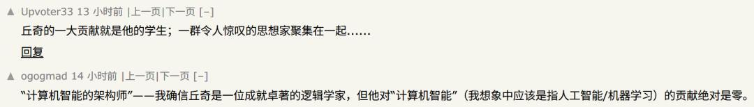 原文将邱奇称为"计算机智能的先驱",这一说法在评论区引发争议。有评论者指出:“我确信邱奇是一位杰出的逻辑学家,但他对「计算机智能」(也就是 AI/ML)的贡献绝对是零。”