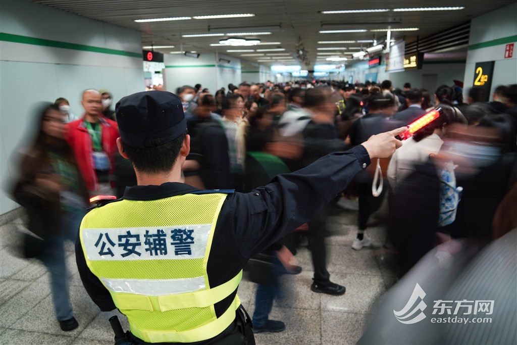 图说:轨交公安辅警在地铁2号线国家会展中心站内疏导客流(蔡黄浩/摄)