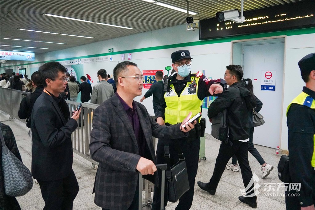 图说:轨交民警在地铁2号线国家会展中心站内疏导客流(蔡黄浩/摄)