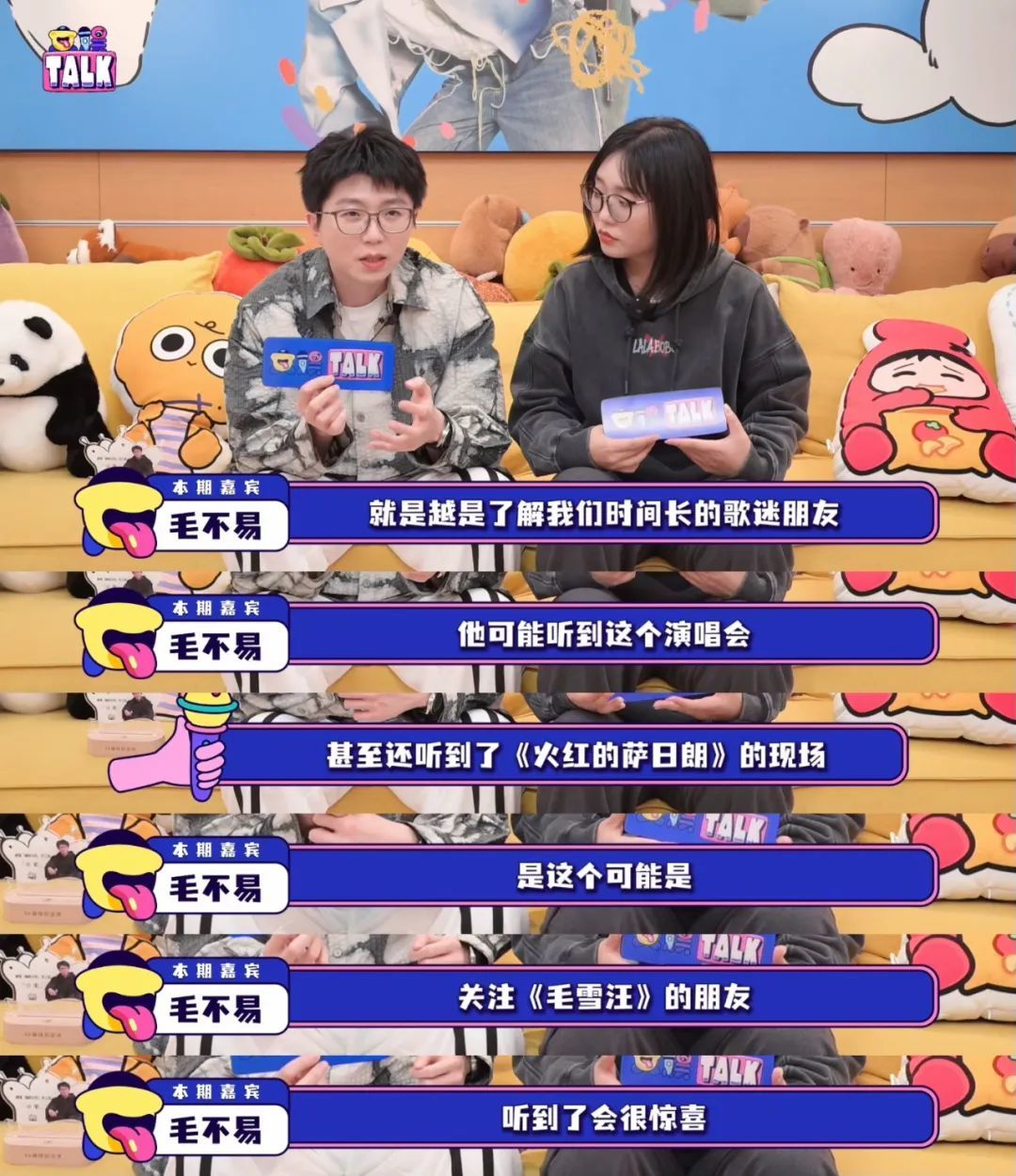 插播:关于上海生日演唱会,毛不易不止一次说是他最想呈现的演唱会的样子,“对于了解我很久的一些歌迷,那是一场很有情怀的演唱会,整个演唱会的编排是按照很多我自己的主题,比方说比赛时期的歌曲,专辑的主打歌等,有很多这样的设计,越是了解我们时间长的歌迷朋友,她可能听到这个演唱会她会越觉得感动。” kk:现场甚至还唱了《火红的萨日朗》完整版,毛毛:是是是,这个可能是关注《毛雪汪》的朋友听到了会很惊喜。这怎么不算有效联动呢?哈哈哈。