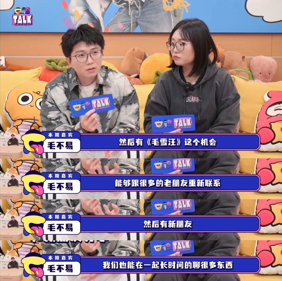 不过呢,他们两个人也都非常认同“《毛雪汪》不白干”这件事,毛不易表示通过《毛雪汪》认识的人变多了,这也是节目带给他的最大收获。“因为其实我们工作之中,反正歌手的工作吧,很少能碰到其他人,因为在舞台上都是自己,否则就是大型活动,大家也很难打招呼,有《毛雪汪》这个机会,能够跟很多的老朋友重新联系,然后有新朋友我们也能长时间的聊很多东西。”