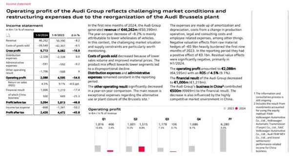 值得注意的是,奥迪的利润暴跌主要归咎于布鲁塞尔工厂的重组费用。然而,中国市场的激烈竞争也对其利润造成了不小的冲击。奥迪在中国市场的利润同比下降了25.3%。