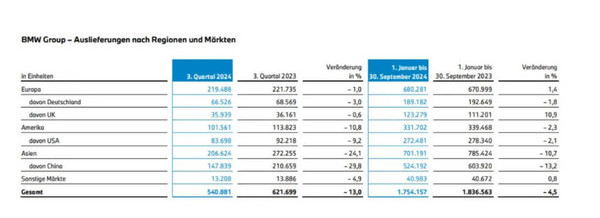在交付量方面,宝马第三季度共交付了54万余辆汽车,同比下降13%。中国市场更是遭遇了29.8%的大幅下滑,成为宝马全球市场中跌幅最大的区域。奔驰和奥迪同样未能幸免,中国市场销量分别下滑10%和8.6%。