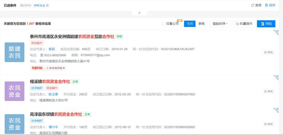 柒财经在天眼查输入“农民资金合作社”,相关存续/在业企业有1597家;输入“农民专业资金合作社”,相关存续/在业企业有810家。