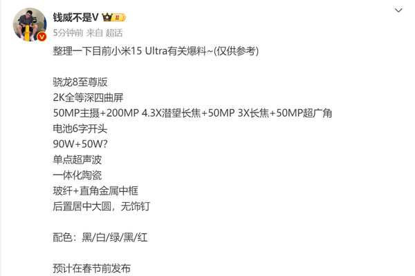 续航方面,小米15 Ultra有望内置一块容量以6字开头的电池,并支持90W有线快充和50W无线快充。
