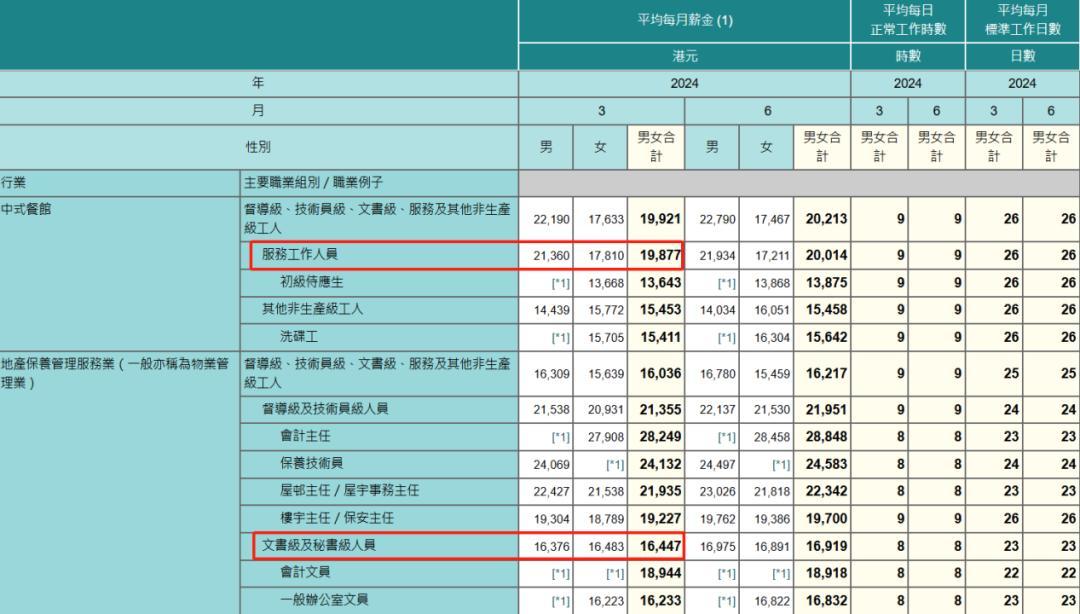 香港餐饮服务员与一般办公室文员薪资对比 图源:香港政府统计处(截至2024年9月26日)