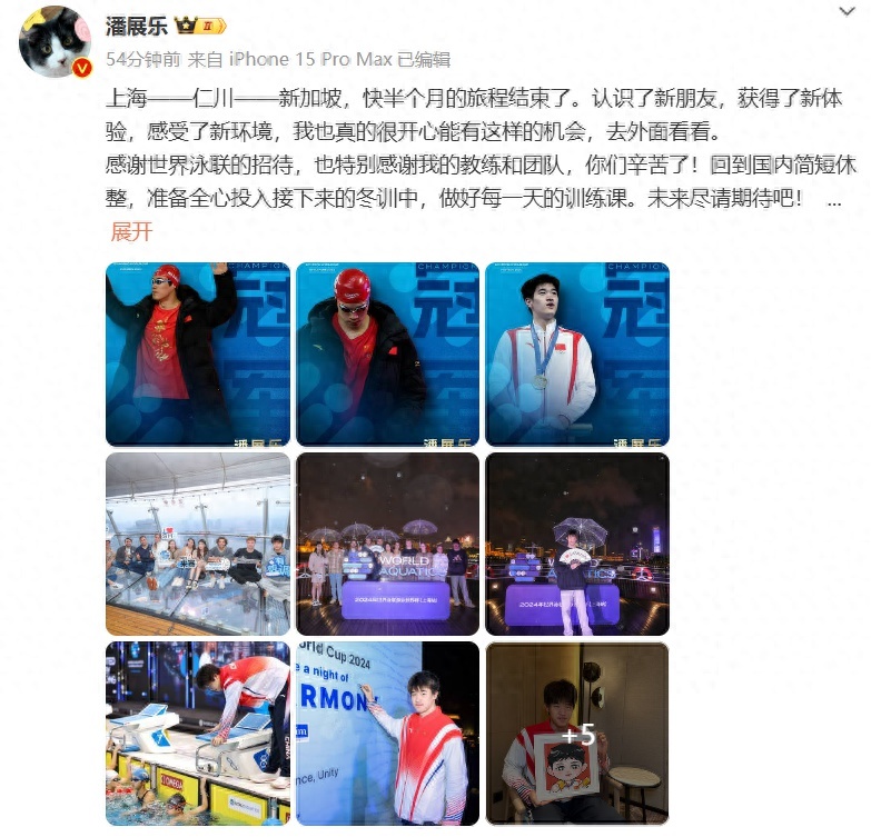 潘展乐写道:“上海——首尔——新加坡,快半个月的旅程结束了。认识了新朋友,获得了新体验,感受了新环境,我也真的很开心能有这样的机会,去外面看看。”