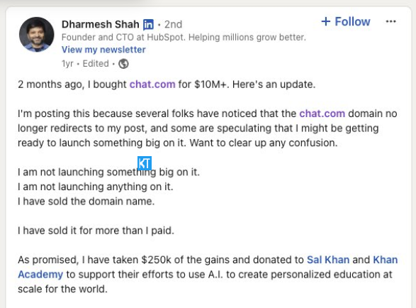 💰 Chat.com曾以1550万美元被HubSpot联合创始人收购。