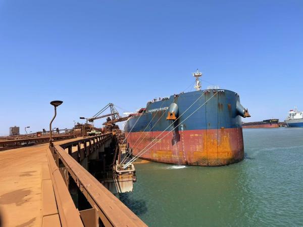 (图说:黑德兰港等待装载铁矿石的中国船舶“HUANGPU RIVER”记者宋笛/摄)