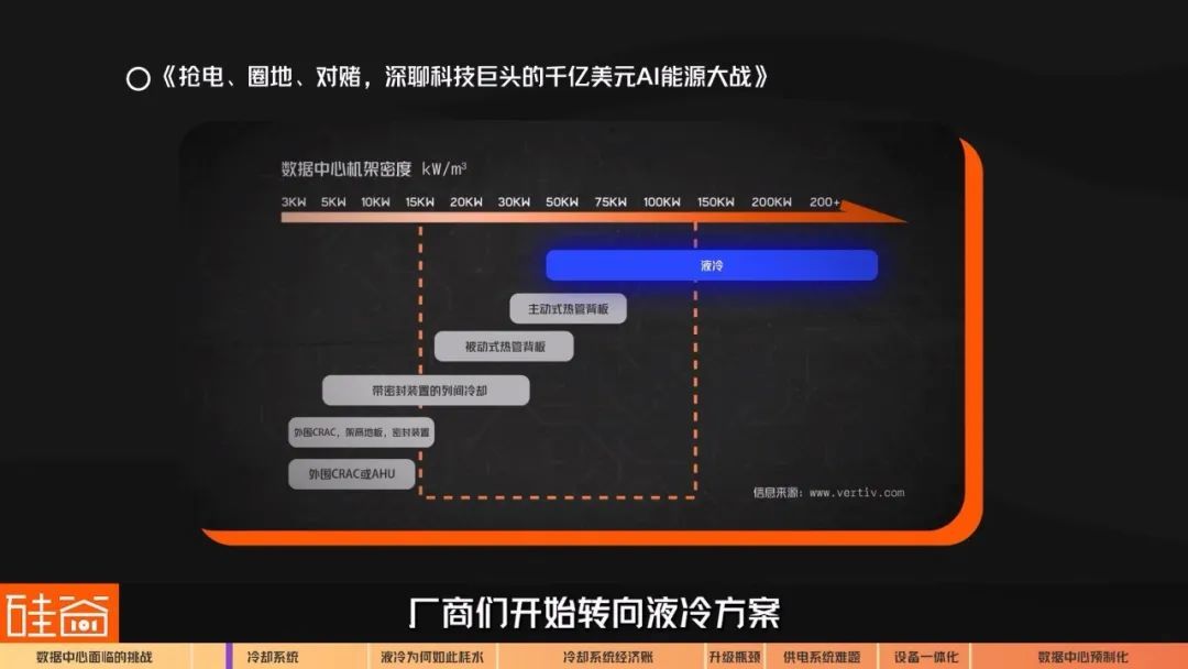 因此,芯片算力的升级也直接带来了对数据中心冷却系统的升级需求。我们在《抢电、圈地、对赌,深聊科技巨头的千亿美元AI能源大战》那期文章里也讲过,随着功率密度的提升,厂商们开始转向液冷方案。